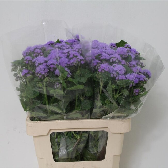 Ein fröhlicher Strauß lila Ageratum (Leberblümchen), der Ihrer Vase oder Ihrem Strauß sofort Farbe und Struktur verleiht. Die frischen, ca. 65 cm langen Stiele bilden flauschige, gefüllte Blüten, die einen schönen Kontrast zu den grünen Zweigen und größeren Blüten bilden. Die Lieferung erfolgt pro 50 Stiele - ideal, wenn Sie üppige, lang anhaltende Farben in Ihrem Zuhause mögen. Diese Blume fällt unter die Kategorien Freshy Flowers und Freshy Flowers A - C; siehe auch Ageratum (Leberbalsam) für ähnliche Sorten.