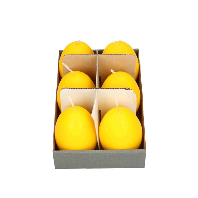 Sechs warme, eiförmige Kerzen in leuchtendem Gelb, die sofortige Atmosphäre in Ihr Zuhause bringen. Sie sind kompakt mit einem Durchmesser von 6 cm und einer Höhe von ca. 9 cm und eignen sich perfekt zum Aufstellen auf einer Platte, einem Tablett oder neben einer Vase. Die glatte Oberfläche und das robuste Wachs sorgen für ein gepflegtes Aussehen, das nicht so schnell langweilig wird, während die sonnige Farbe jedem Interieur eine verspielte, elegante Note verleiht, ohne viel Pflegeaufwand.