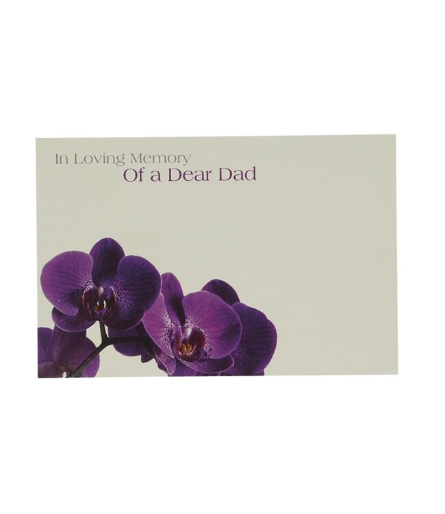 Ein dezentes und respektvolles Kärtchen mit dem Text "In Loving Memory DAD" in Naturweiß, ideal zum Anbringen an Trauersträußen oder Gedenkstücken. Dieses Set mit 50 Etiketten 4A (9 x 6 cm) besteht aus stabilem Karton mit einem ruhigen Look, der nicht dominiert und ihm ein gepflegtes, elegantes Aussehen verleiht. Es passt gut in die Kategorien Floristenbedarf, Etiketten und Floristik.