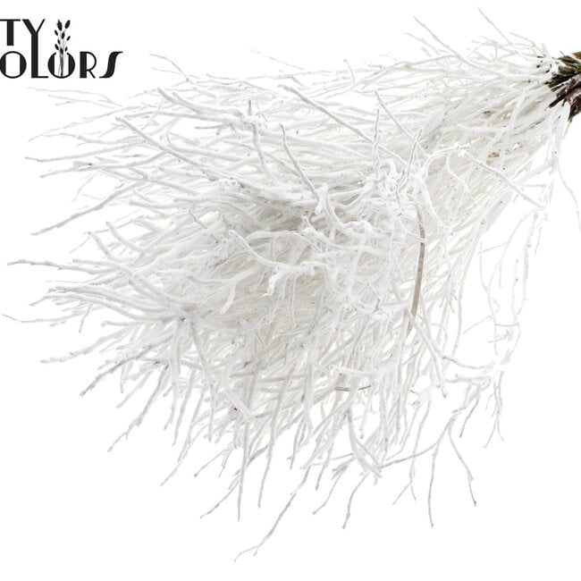 Diese beflockten weißen Heidelbeerzweige (Vaccinium) von QC bringen eine subtile, natürliche Eleganz in Ihr Zuhause, ohne viel Aufhebens zu machen. Die sanft gesprenkelte Oberfläche verleiht ihnen Tiefe und Struktur, wodurch sie sich wunderbar mit anderen Trockenblumen wie getrockneten Rosen, Mohn, Ginster, Ruscus und Helichrysum kombinieren lassen - ideal für alle, die eine warme, rustikale oder moderne Ecke mit einem dauerhaften Akzent verschönern möchten.