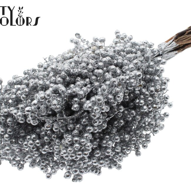 Getrocknete Pfefferbeeren-Stecker | Farbe: Silberfarben mit Glitzer | Schinus Trocken-Dekoration | Gewicht ± 170 Gramm | Pro 5 Bündel