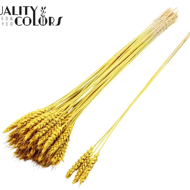 Dieser sonnige getrocknete Weizen von QC bringt sofortige Wärme und Textur in Ihr Interieur. Als Teil unserer Trockenblumenkollektion und perfekt platziert mit Trockenblumen P - Z - vor allem unter Triticum (Weizen) -erhalten Sie etwa 25 Büschel pro Strauß, jedes Büschel mit drei Zweigen und Ähren von etwa ±55 cm, in einer fröhlichen gelben Farbe, die lange schön bleibt.