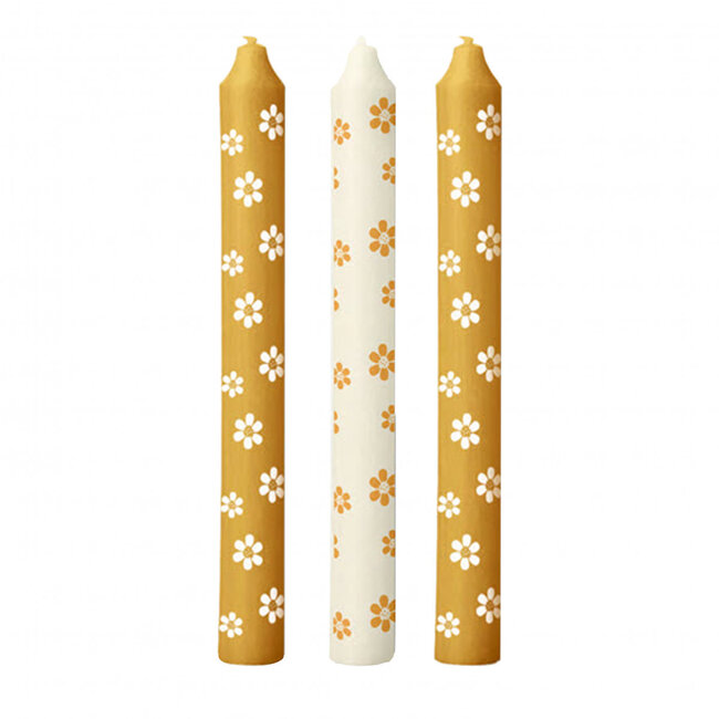 Drei fröhliche, gelbe Kerzen mit dezenten Blumenakzenten, die sofort Stimmung in jeden Raum bringen. Jedes Exemplar ist schlank (ongefähr 2,2 cm im Durchmesser) und 20 cm lang, wodurch sie perfekt für einen Esstisch, eine Fensterbank oder zwischen deinem Lieblingsgetrockneten Blumenstrauß sind. Die warme gelbe Farbe und das Blumenaccent geben einen frischen, heimischen Touch, der schön zur Heimdekoration passt und sowohl zu klassischen als auch zu modernen Stilen harmoniert.