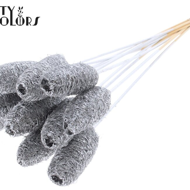 Diese kleine Luffa am Stiel verleiht Ihren Trockensträußen oder Seidenarrangements sofort Textur und einen verspielten, natürlichen Akzent. Pro Strauß erhalten Sie zehn ca. 50 cm lange Stäbchen in einem dezenten Silberton, der sowohl zu warmen, getrockneten Tönen als auch zu frischen, modernen Farben passt. Das Modell ist leicht und robust, ideal, um zwischen getrockneten Rosen, Mohn oder Helichrysum platziert zu werden, ohne zu viel Gewicht zu haben.
