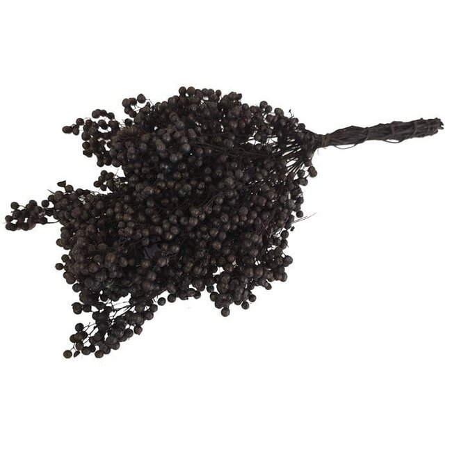 Diese schwarze Schinus Pfefferbeeren Trocken-Dekoration von Dutch Dried verleiht jedem Winkel deines Hauses ein robustes, natürliches Aussehen. Mit einer Länge von ungefähr ±35 centimeter und einem Gewicht von rund ±150 gram sind die Zweige leicht genug, um sie problemlos in eine Vase zu stellen, aber voluminös genug, um wirklich aufzufallen; die fast schwarzen Beeren und festen Stiele behalten ihre Textur und Farbe jahrelang ohne Wasser oder Pflege, wodurch sie perfekt als dauerhafter Blickfang auf dem Tisch oder Regal sind.