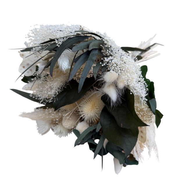 An airy dried bouquet with a fresh mix of bleached and green dried flowers that instantly adds atmosphere to any spot in the house. The combination of soft Helichrysum stars, subtle ruscus, playful poppy heads, and the warm tones of dried roses and broom creates a natural, approachable look that remains beautiful for a long time. At MyFlowers, you can see exactly how these textures and shades work together to form a stylish, handmade accent without hassle.