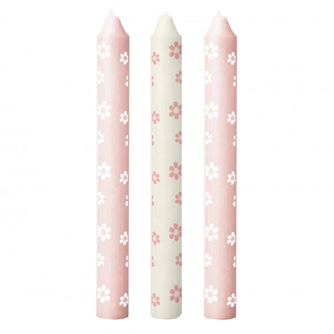 A playful set of three slender pink candles (Ø 2.2 cm, length 20 cm) with subtle floral decorations that instantly add atmosphere to any space. These candles from 4A combine elegant lines with a soft, feminine colour, making them a perfect fit within the categories Candles, Floristry, and Home Decor, and immediately provide a warm, stylish accent to tables, sideboards, or windowsills.