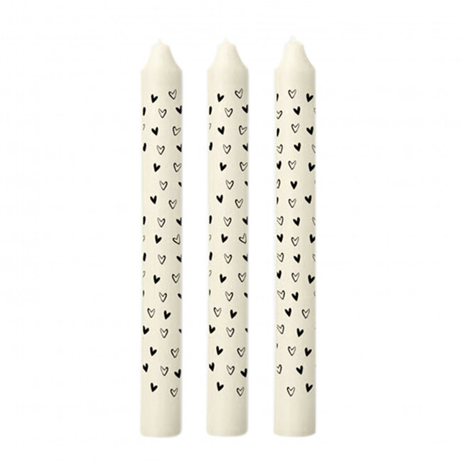 These cheerful heart candles add a playful and elegant touch to any interior: sleek black and fresh white with subtle heart motifs, ideal for creating atmosphere during dinners, on the windowsill, or as an extra detail in floral arrangements. With a slim diameter of 2.2 centimetres and a length of 20 centimetres, they are just the right size to fit most candle holders and come in a set of 3, providing you with a balanced styling for tables or corners in the home. The candles from 4A feel solid and maintain their shape and colour beautifully, making them perfect for occasions such as Candles, Weddings and Mother's Day, but they are equally suitable for Valentine's Day, Floristry, Home Decor, and other occasions when you want to add something special without hassle.