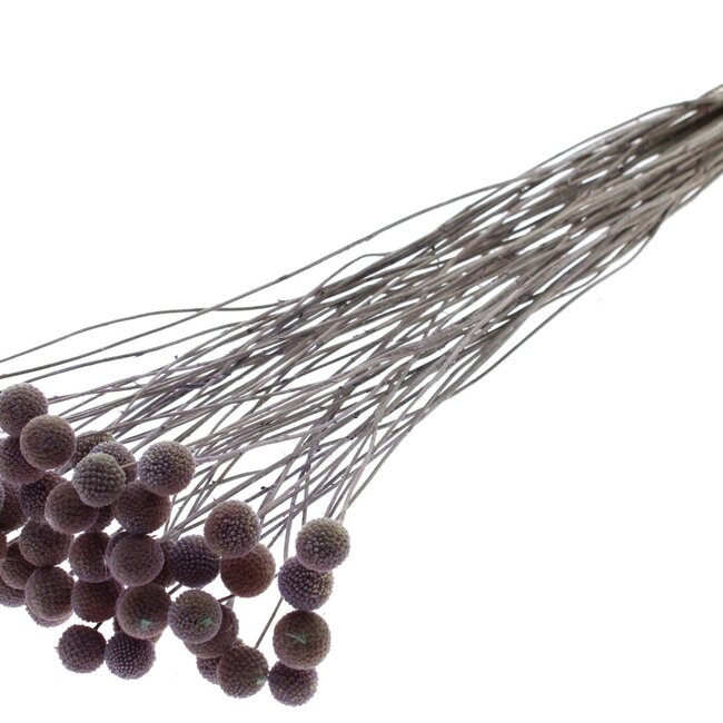 These dried craspedia in a soft Frosted Milkapurple shade instantly add character to any vase: cheerful, spherical heads on slender drumsticks that retain their colour and shape for a long time. With ten stems per bunch, your bouquet immediately has sufficient volume, and the graphic round shapes work wonderfully with other dried flowers such as dried roses, poppies, broom, ruscus, and Helichrysum for a playful yet stylish result.