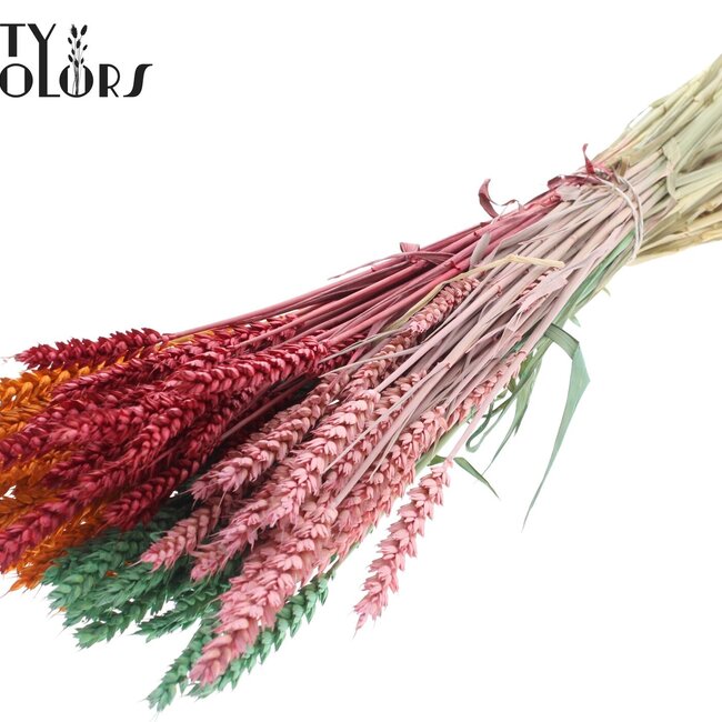 This bunch of Triticum in mixed colours is a cheerful, low-maintenance addition to your interior. At QC you can find these Dried Flowers from the category Dried Flowers P - Z and specifically the Triticum (Wheat) collection. With a length of approximately 60 cm and a weight of ±220 grams per bunch, the softly tinted ears give a summery, warm appearance that remains beautiful for a long time without much care.