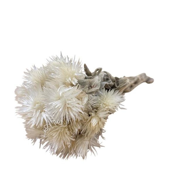 These natural white Cape Everlasting dried flowers from Dutch Dried give your interior a soft, timeless look without any hassle. The fine yet sturdy petals of the Helichrysum retain their shape and bright natural white surprisingly long, and look beautiful as a solo piece or mixed with dried roses, poppies, broom, and ruscus for a playful and elegant bouquet.