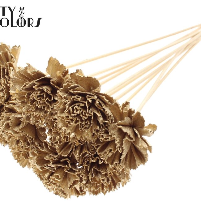 This antique gold-coloured Shola wooden karnish flower on stem has a refined, natural appearance that instantly adds warmth and elegance to any interior. The flower has a diameter of 6 centimetres and is on a stem of approximately 50 centimetres in length, making it stand out beautifully in a vase or can be added to a bouquet; each bunch contains 10 stems. Perfect for lovers of Artificial Flowers and the gentle charm of Shola Flowers, and fits beautifully within the Karnish Flower series.
