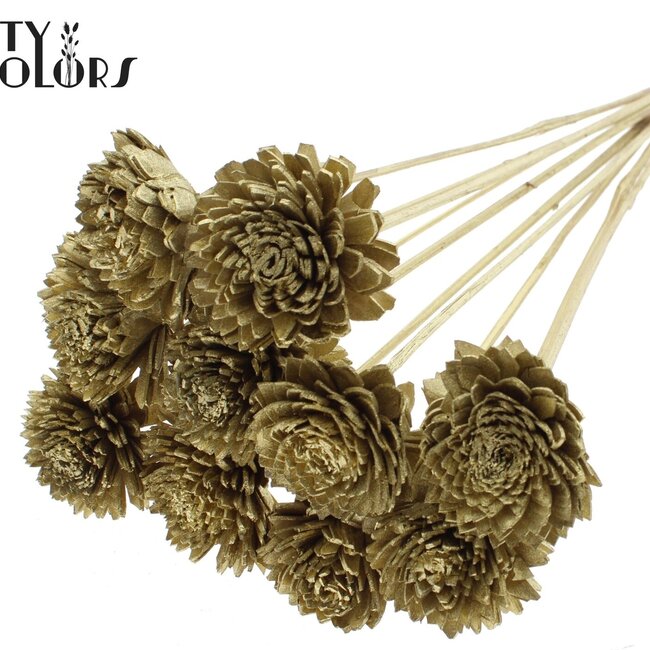 Golden, handmade zinnias made from light shola wood instantly add warmth and subtle shine to your interior. Each flower has a natural texture and a flower diameter of about 6 centimetres, attached to a fine stem of approximately 50 centimetres and supplied in a bunch of 10 stems, making them ideal for brightening up vases or as refined accents scattered throughout your home. As part of the Artificial Flowers collection and the Shola Flowers line, they offer the sophistication of real flowers without the maintenance; brand: QC.