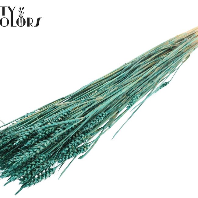 Sun-bleached wheat in a soft Pearl Turquoise shade instantly brings a sunny, natural touch to your home. This charming bunch from the QC collection fits perfectly among your dried flowers and, with its fine ears, provides a calm, textured look—a subtle eye-catcher on the windowsill, in a vase, or as part of a mix with other dried flowers from Triticum (Wheat).