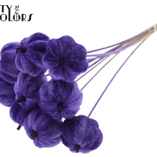 This soft, purple velvet pumpkin on a stick from QC instantly brings atmosphere to your home without any hassle. With a pumpkin approximately 6 cm in diameter and a stick of ±50 cm, the picks are nicely present yet subtle, and they come in bunches of 10 so you can create multiple decorations at once. The velvet feels luxurious, the colour remains beautiful, and since they are not fresh flowers, there's no maintenance required — ideal as a lasting touch in your autumn or Halloween styling.