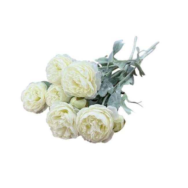 These soft, realistic white ranunculus from Dutch Dried instantly give any space an elegant, fresh look without any hassle. Each stem has three flowers and is approximately 50 cm long, making them perfect for filling a tall vase or combining with other pieces from the Art & Silk Top 10 and Flowers & Stems collection.