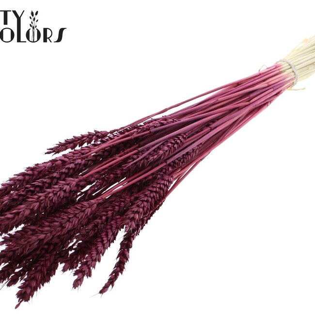 Un bouquet de Triticum blanchi dans une couleur bordeaux profonde apporte immédiatement du caractère à votre maison sans tracas. Ces fleurs séchées d'environ 60 cm de long (±60 cm) et environ 100 grammes par bouquet combinent des épis naturels et aérés avec une couleur riche qui dure longtemps ; parfait pour un grand vase sur le buffet ou comme touche élégante dans un couloir. C'est un bel ajout à notre gamme de Fleurs Séchées et s'accorde facilement avec d'autres favoris comme Helichrysum, ruscus ou roses séchées — vous trouverez cette variété sous Fleurs Séchées, Fleurs Séchées P - Z et Triticum (Blé).