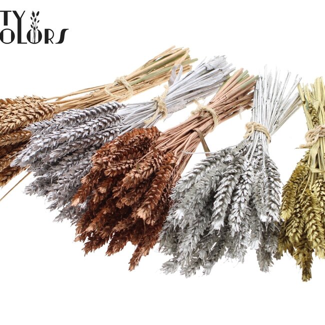 Petites tiges de Triticum dans un mélange de couleurs métalliques saisissant — chaque petit bouquet mesure environ 25 cm de long et est livré par 10 bottes, parfait pour ceux qui aiment les accents durables et nécessitant peu d'entretien à la maison. Ce Bouquet de Fleurs Séchées fait partie de nos Fleurs Séchées et Bouquets et provient de la famille reconnaissable des Triticum ; découvrez-en plus sur Triticum (Blé). Les teintes brillantes et la taille compacte les rendent idéales pour être placées seules ou comme complément texturé dans des compositions plus grandes, et vous reconnaîtrez immédiatement la qualité — ce sont des fleurs séchées dignes de MyFlowers de QC.