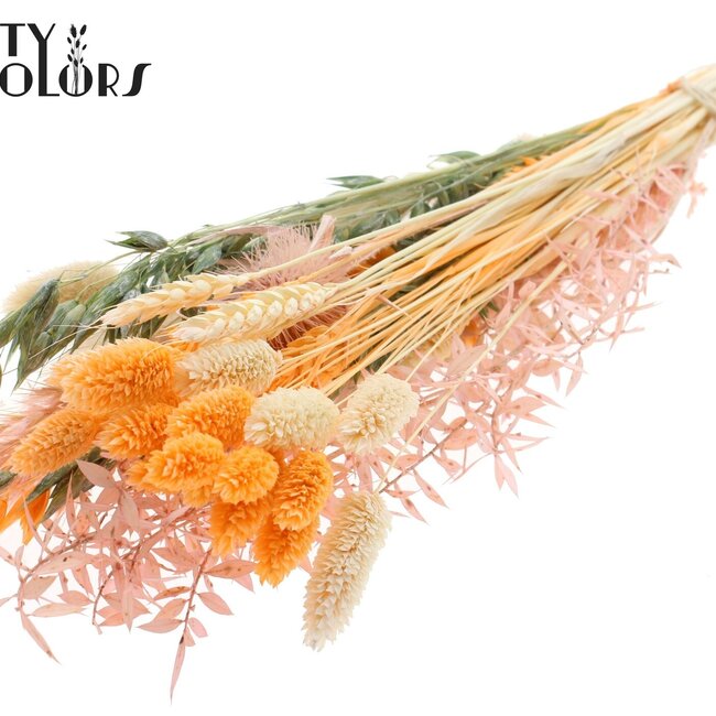 Ce doux bouquet rond de fleurs séchées dans des tons abricot chauds est un mélange ludique de roses séchées, pavot, genêt, ruscus et Helichrysum — tous avec ce charme naturel et rustique qui rend les fleurs séchées si appréciées. Le design provient de la collection de QC et s'accorde parfaitement avec les articles de la catégorie Bouquet de Fleurs Séchées, Fleurs Séchées et Bouquets; ensemble, ces variétés créent des formes intéressantes et une palette de couleurs douce et stratifiée.