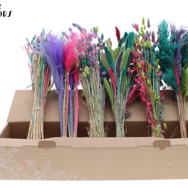 Un mélange ludique et polyvalent de fleurs séchées aux couleurs variées qui apporte immédiatement de l'ambiance à la maison : pensez à de douces roses séchées, des capsules de pavot légères, du ruscus aérien, de l'Helichrysum chaleureux et du Lagurus (Queue de lièvre) velouté pour une texture supplémentaire. Cette composition combine charme naturel avec des couleurs vives et durables et des formes uniques, donnant à chaque bouquet une sensation artisanale sans tracas ni entretien.