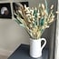 Het boeket combineert herkenbare favorieten zoals gedroogde rozen met speelse elementen als papaver, brem (broom), ruscus en Helichrysum, waardoor er veel textuur en diepte ontstaat. Deze droogbloemen behouden hun kleur en vorm lang en vragen nauwelijks onderhoud, wat ze ideaal maakt voor wie wil genieten van een duurzame, stijlvolle touch in huis of een blijvende, persoonlijke gift wil geven zonder veel gedoe.