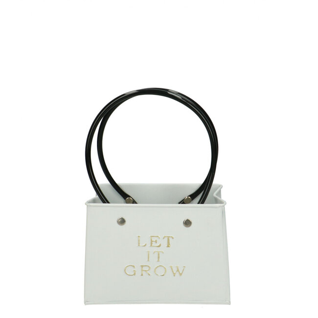 Een speelse tasvormige zinken bloempot in Naturelle Wit met de vrolijke tekst "Let it grow" die meteen sfeer toevoegt aan elke hoek van je huis. Het compacte formaat (hoogte 11,5 cm, lengte 14 cm, breedte 7,5 cm) maakt 'm ideaal voor kruiden, kleine vetplantjes of als leuke stylingtouch op een vensterbank of plank — de licht verweerde zinklook geeft een warme, vintage-industrial vibe zonder gedoe.
