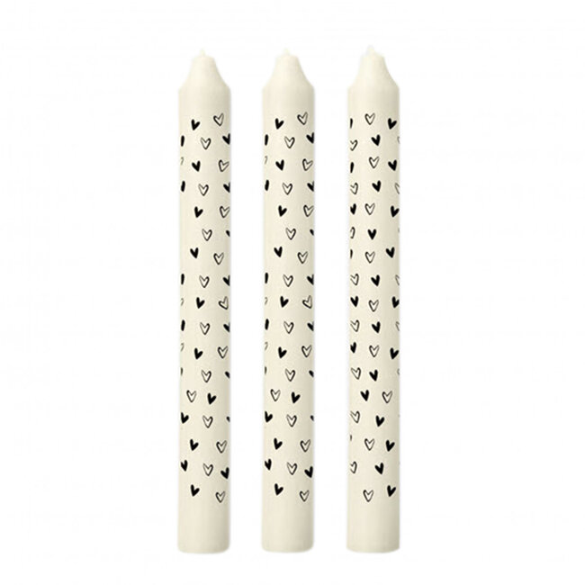 Slanke zwart-witte kaarsen met speelse hartjesprint, elk ongeveer 2,2 cm in diameter en 20 cm hoog, geleverd per set van drie — perfect voor wie subtiele romantiek zoekt zonder poespas. Bij MyFlowers vind je deze charmante exemplaren van 4A, een design dat in één oogopslag warmte toevoegt aan je interieur zonder al te opvallend te zijn.