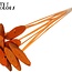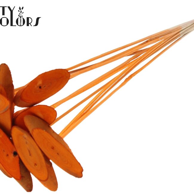 Deze vrolijke, oranje houtschijf op stok brengt direct warmte en natuurlijke charme in elk droogboeket of prikstuk. De ovale schijfjes hebben een diameter van ongeveer 5–7 centimeter en zitten op een stok van ±50 centimeter; per bos ontvang je 10 bijstekers, ideaal om structuur en kleur toe te voegen aan je creaties. Als je van het combineren houdt, werken ze prachtig naast gedroogde rozen, papaver, bezem (broom), ruscus en Helichrysum en passen ze perfect binnen de categorieën Bijstekers en Droogdeco.